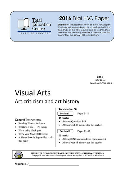 This paper has been written by experienced markers and teachers to provide an authentic examination experience for HSC Visual Arts students. Marking guidelines are provided. It is excellent practice for the actual written examination. Two versions of the paper are available: Word and PDF. The Word version is for a teacher as it can be easily cut and pasted and is copyrighted to use...
